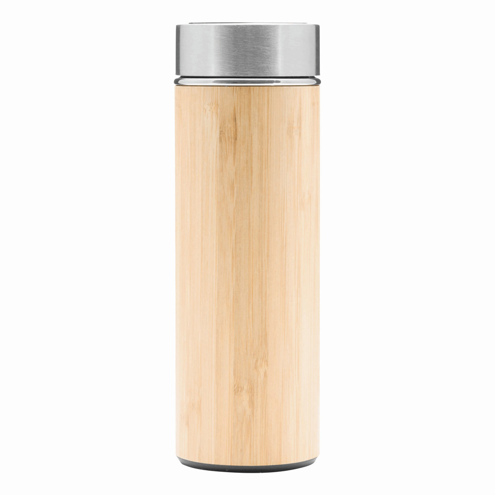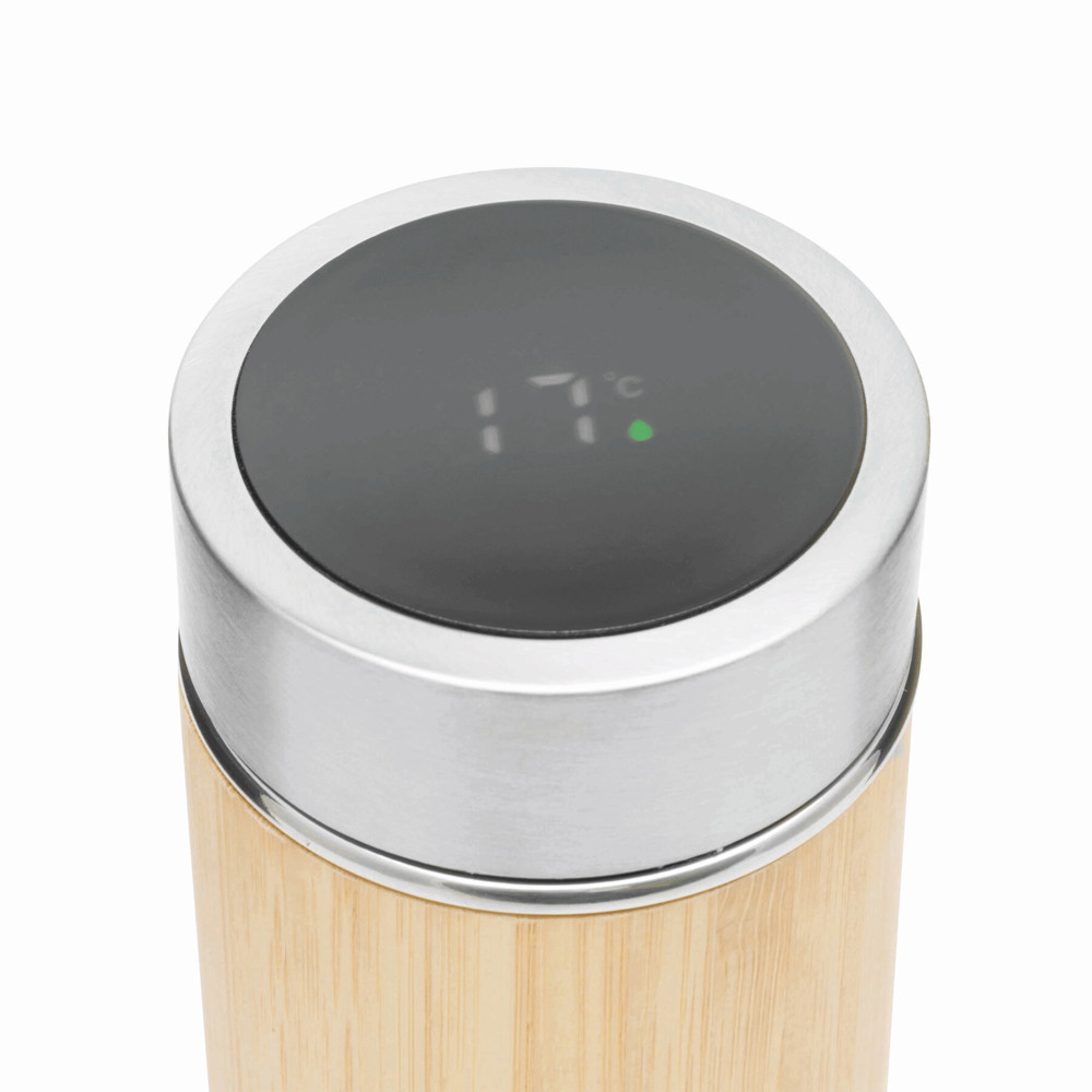Vakuum-Isolierflasche BAMBOO TEMP, doppelwandig: innen und außen aus Edelstahl, mit Bambus-Ummantelung, Deckel mit sicherem Schraubverschluss, Silikondichtung und integriertem digitalen Thermometer, mit herausnehmbarem Teesieb, Füllmenge ca. 400 ml