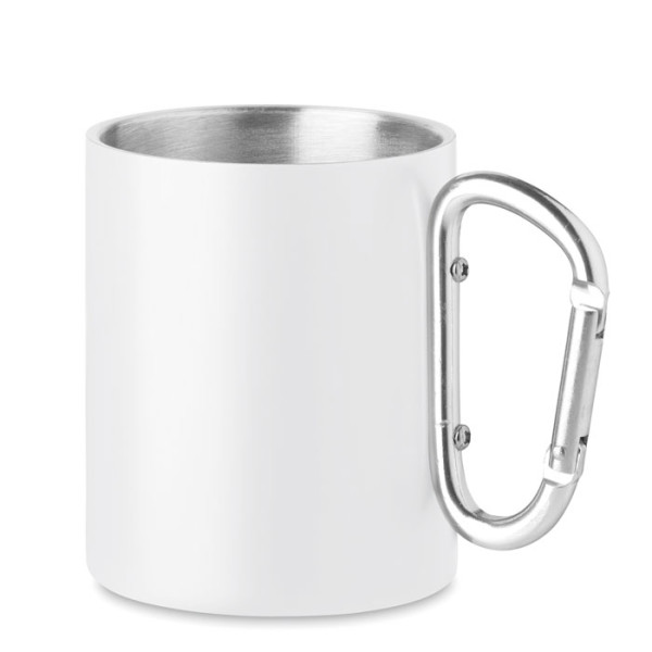 Doppelwandiger Trinkbecher aus Edelstahl. Henkel mit Karabiner. Füllmenge: 300 ml. Der Karabiner ist NICHT als Sicherung beim Klettern geeignet.