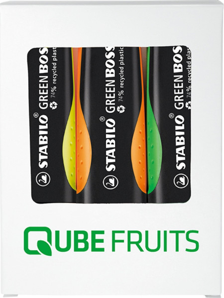 GRÜNES GEWISSEN BEI VOLLER LEUCHTKRAFT. Schreibset mit 3 Textmarkern STABILO GREEN BOSS im weißen Karton-Etui. Textmarker aus 74% recyceltem Kunststoff in klassischer Form mit weicher, ergonomischer Griffzone. 2 Strichstärken, nachfüllbare Tinte. Intelligente Anti-Dry-Out-Technologie mit 4 Stunden Austrockenschutz.