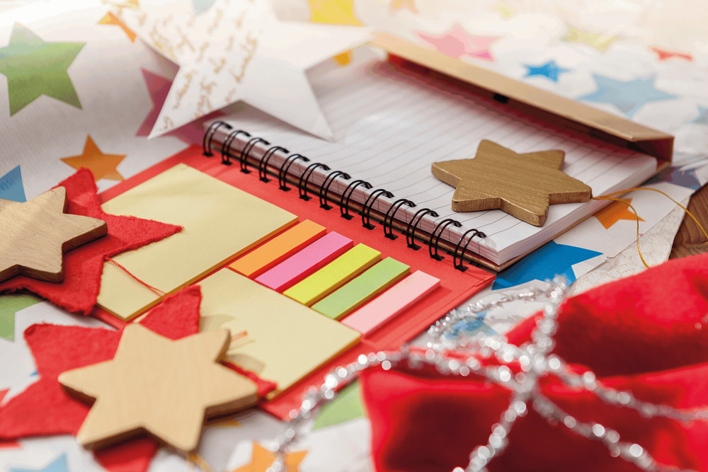 Notizbuch MAGNY: 70 Blätter, liniert, inkl. Kugelschreiber (schwarzschreibend) aus Kunststoff/Pappe, mit 2 Klebenotizzettelblöcken (25 Stück groß, 25 Stück klein), 5 verschiedenfarbigen Klebenotizstreifen, mit Ringlochung und magnetischem Verschluss