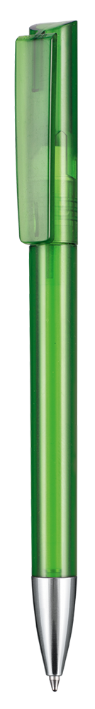 Kugelschreiber mit Drehmechanik und angespritztem Clip. Glänzende Oberflächen, transparentes Gehäuse und Metallspitze vermitteln Wertigkeit. Gutes Preis-Leistungsverhältnis. Ausgestattet ist dieses Schreibgerät mit einer blau schreibenden Budget-Großraummine.