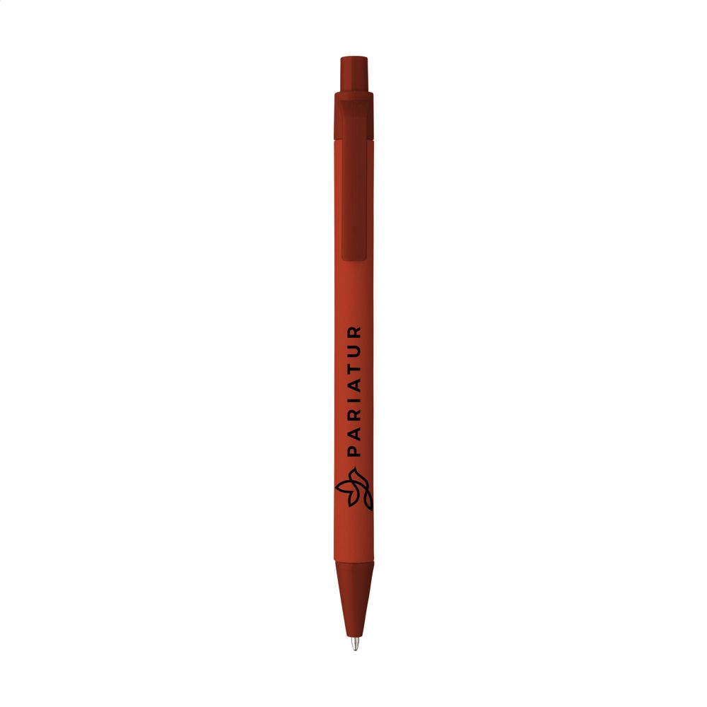 Blauwchreibender Kugelschreiber mit Halter aus Recyclingpapier. Der Clip, der Druckknopf und die Spitze bestehen aus biologisch abbaubarem PLA.