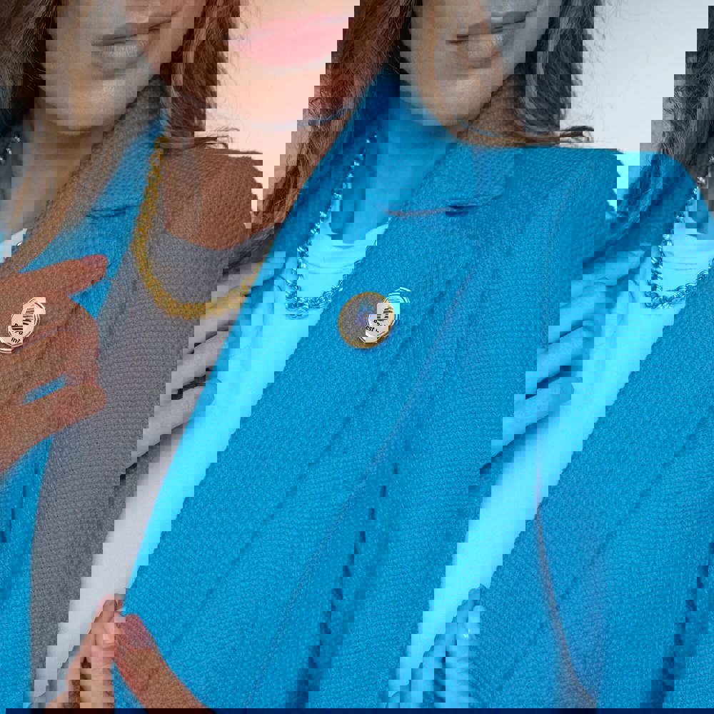 Runder Pin mit Doming und Schmetterlingsverschluss.