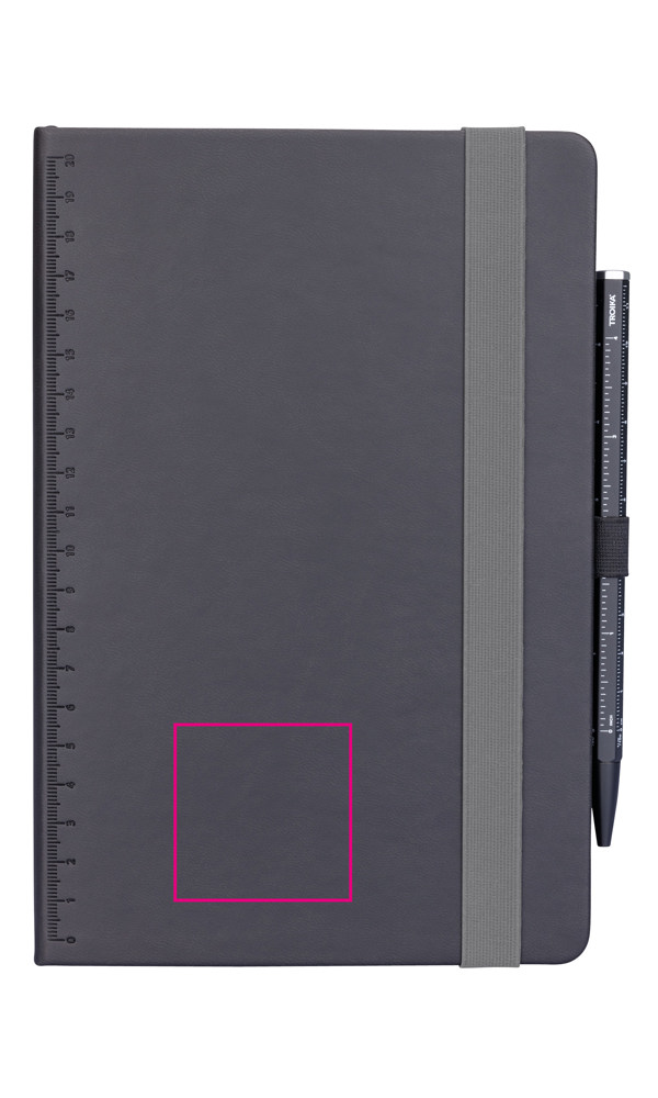 Notizblock DIN A5 inkl. Kugelschreiber, Elastikband-Verschluss, Stiftschlaufe, Lesezeichen, geprägtes Lineal (20 cm) auf Cover, FSC zertifiziertes Papier, 64 perforierte Blätter (128 Seiten), Punktraster, Fach für Belege, Kugelschreiber CONSTRUCTION BASIC (schwarze D1 Mine), Kunstleder, Metall, matt, schwarz