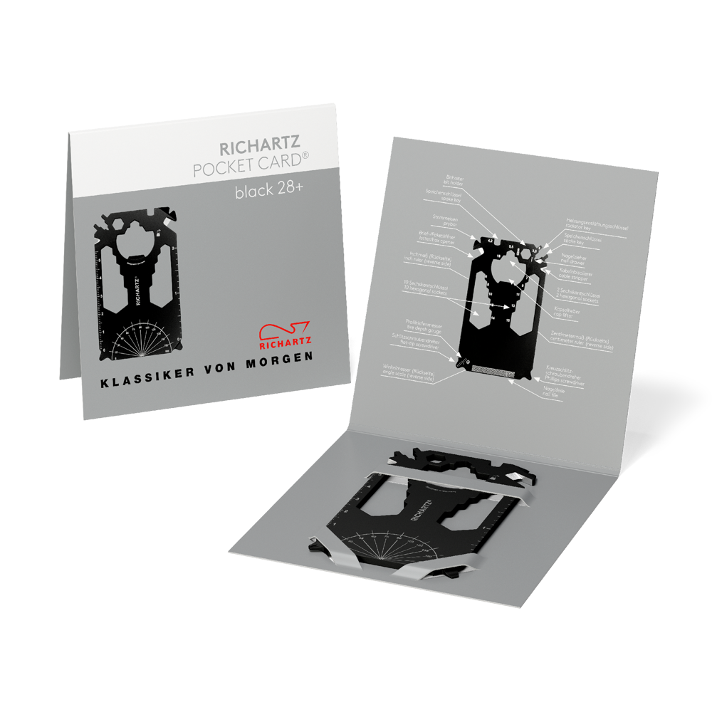 RICHARTZ POCKET CARD® black 28+ ist der erfolgreiche Werbeträger für Marken und Unternehmen. Mit einer individuellen Lasergravur und individuell gestalteter 4-seitigen Verpackung in 4c, werben Marken aufmerksamkeitsstark und aussagekräftig!