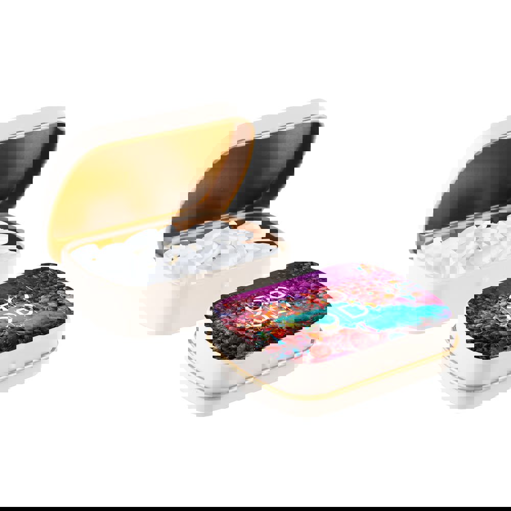 Mini Klappdeckeldose in Sand mit goldener Innenseite und ca. 23 Gramm Pfefferminz. Mit Vollfarbdruck, Inhaltsstoffaufkleber und Siegel.