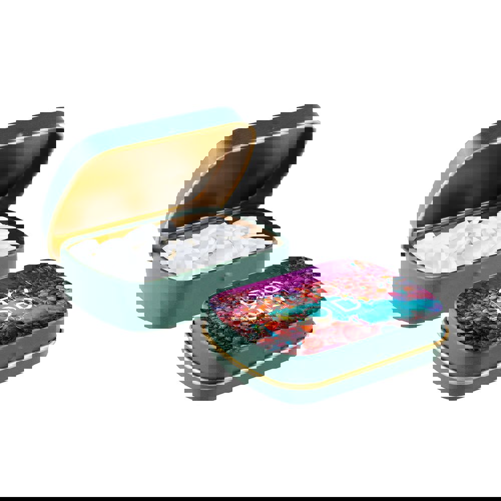Mini Klappdeckeldose in Mattgrün mit goldener Innenseite und ca. 23 Gramm Pfefferminz. Mit Vollfarbdruck, Inhaltsstoffaufkleber und Siegel.