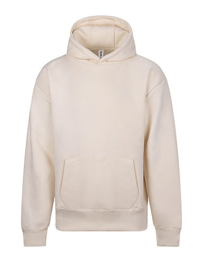 Ringgesponnene Baumwolle / recycelter Polyester | Oversize fit | Schweres Material | Doppellagige Kapuze mit drei Segmenten | Kängurutasche mit Handy-Innentasche | Keine Kordelzüge | Gerippte Ärmelabschlüsse und Saum | Gebürstetes Innenvlies | 100 % Baumwoll-Obermaterial | Abreißetikett