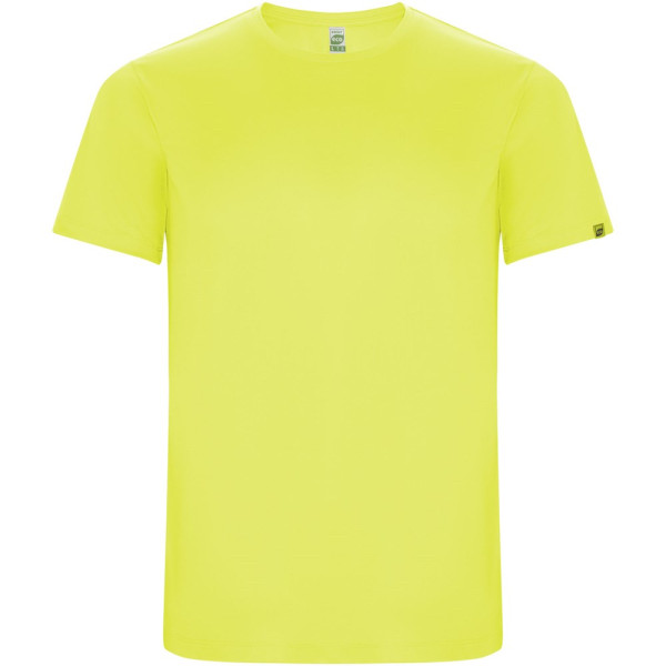 Funktions-T-Shirt aus recyceltem Polyester CONTROL DRY. Rundhalsausschnitt mit farblich abgesetzten Nähten. ECO-Logo-Etikett am Ärmel. Verpackung aus Recyclingmaterial. Herausnehmbares ECO-Etikett. Verpackung aus Recyclingmaterial. Technisches Gewebe. Das Modell ist 180 cm groß und trägt Größe M.