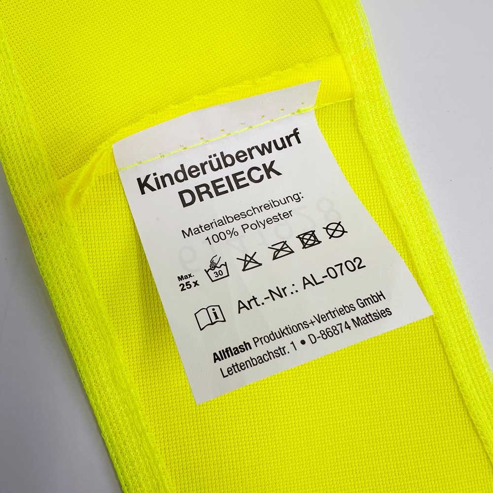 Unser Kinderüberwurf DREIECK EASY wird aus 100% Polyester produziert. Die reflektierenden Elemente auf Vorder- und Rückseite des Überwurfes garantieren eine verbesserte Sichtbarkeit bei einsetzender Dämmerung und bei Dunkelheit.