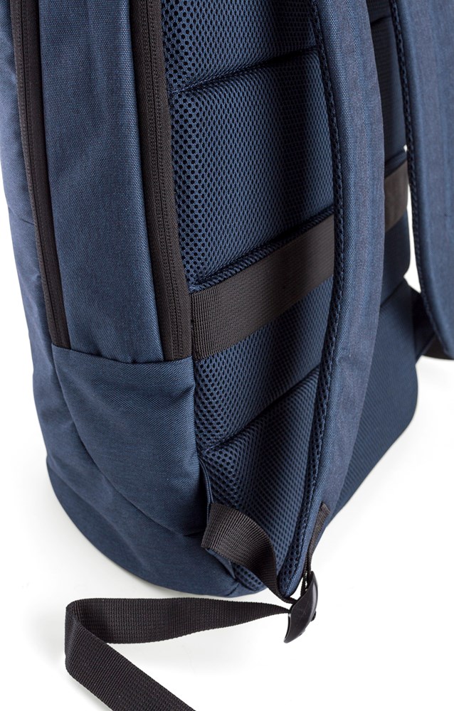 Zweifarbiger Rucksack aus Polyester (600D). Zwei Reißverschlusstaschen auf der Vorderseite und zwei große Reißverschlussfächer auf der Oberseite, mit einem Laptopfach im Inneren. Der Rucksack ist verstärkt und verfügt über einen Trolley-Gurt.