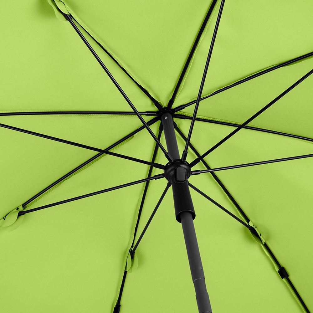 Moderner Sonnenschirm mit Gestell in Titan-Finish, Knickvorrichtung und mit Volant Einfache Handhabung durch Sicherheitsschieber, sehr stabile Fiberglasschienen, zweiteiliger und stufenlos höhenverstellbarer Stock mit Knickvorrichtung zur Neigung des Schirms, Stock in edlem Titan-Finish, Unterstock mit ca. 120 cm Länge und Drehfeststeller zur sicheren Fixierung, komfortables Tragefutteral, Bezug mit Lichtschutzfaktor UPF 50+, angeschnittenes Volant, exklusive Füllständer (Art. 8920 oder Art. 8905) / Erdspieß (Art. 8939)