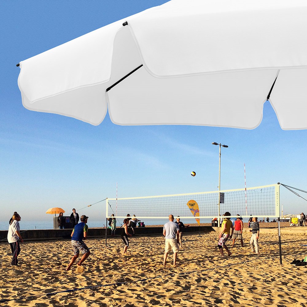 Moderner Sonnenschirm mit Gestell in Titan-Finish, Knickvorrichtung und mit Volant Einfache Handhabung durch Sicherheitsschieber, sehr stabile Fiberglasschienen, zweiteiliger und stufenlos höhenverstellbarer Stock mit Knickvorrichtung zur Neigung des Schirms, Stock in edlem Titan-Finish, Unterstock mit ca. 120 cm Länge und Drehfeststeller zur sicheren Fixierung, komfortables Tragefutteral, Bezug mit Lichtschutzfaktor UPF 50+, angeschnittenes Volant, exklusive Füllständer (Art. 8920 oder Art. 8905) / Erdspieß (Art. 8939)