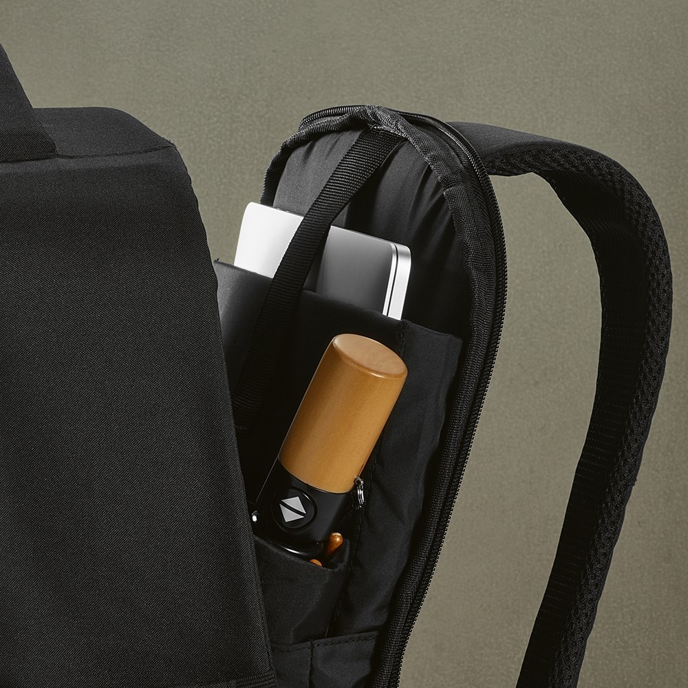 Verbessern Sie Ihren Stil auf nachhaltiger Weise mit unserem 16L Rucksack aus recyceltem PU. Es besitzt einen diagonalen, thermo-eingespritzten Reißverschluss an der Vorderseite und ein einzelnes 15,6-Zoll-Laptopfach. Für mehr Komfort: Rückenpolsterung, Trolley-Gurt und verstärkter Griff.