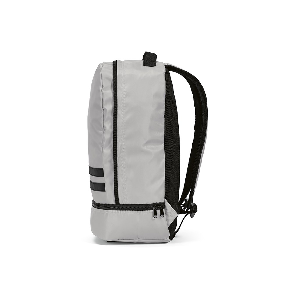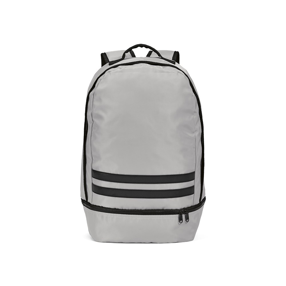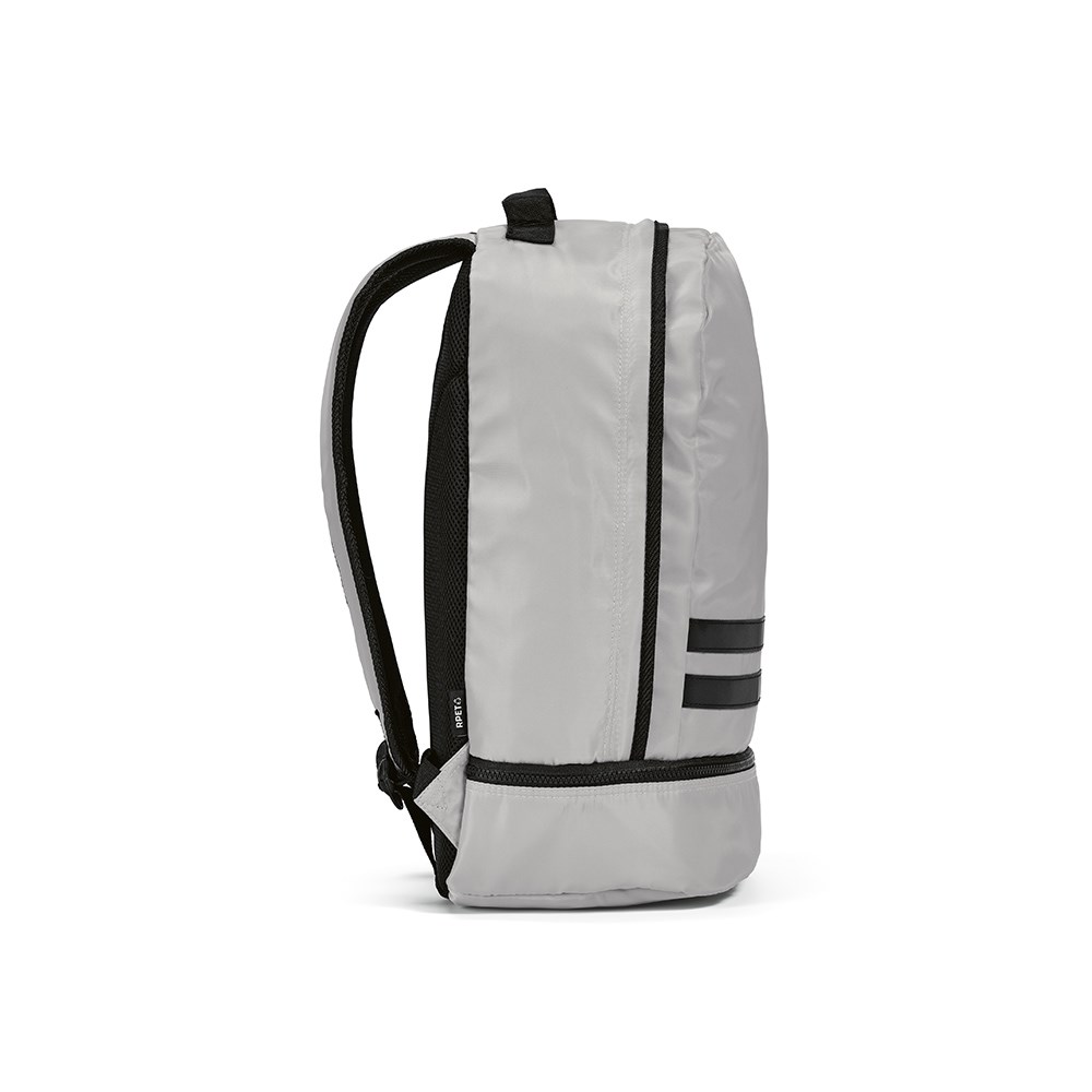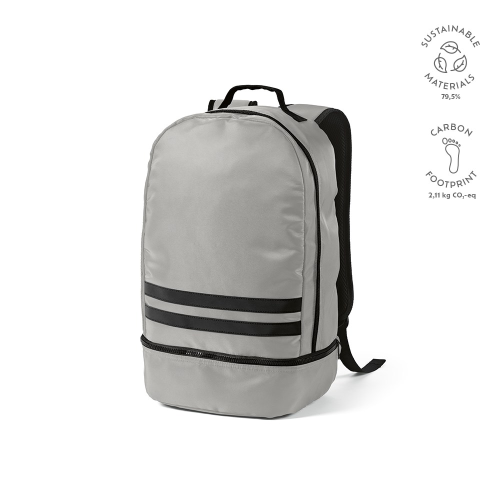 Dieser 25L Rucksack aus rPET wurde unter dem Motto "Funktionalität" entwickelt. Mit Rückenpolsterung, verstärkten oberen Tragegriff und zwei schwarzen reflektierenden Streifen auf der Vorderseite für Sicherheit. Auf der Unterseite, eine separate Tasche ideal für Schuhe. Ein Design, welches das praktische Nutzen zielt.