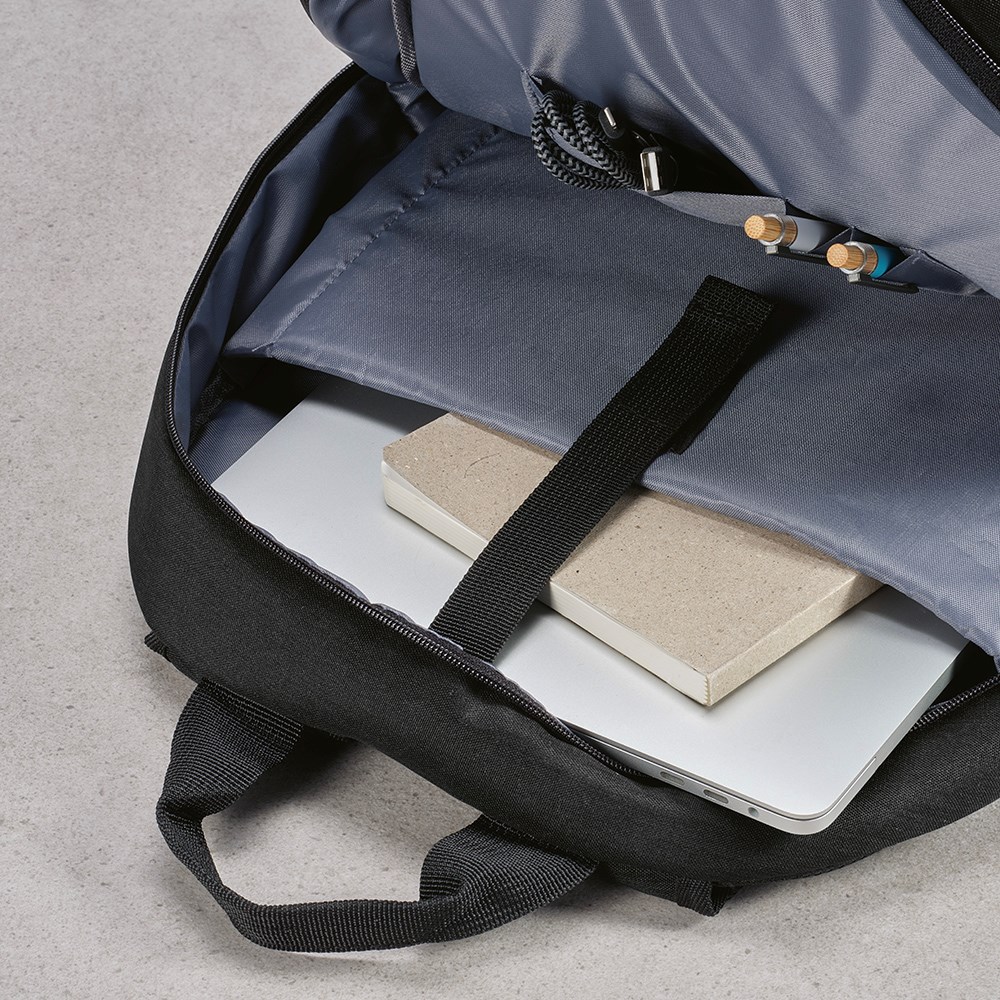 In unserem 300 D rPET-Rucksack mit 18L Fassungsvermögen trifft Effizienz auf Nachhaltigkeit. Seine Seitentasche und ein Vorderfach mit Reißverschluss sorgen für zusätzliche Nützlichkeit. Der verstärkte Griff an der Oberseite erleichtert die Mobilität in der Stadt und sorgt für Haltbarkeit.