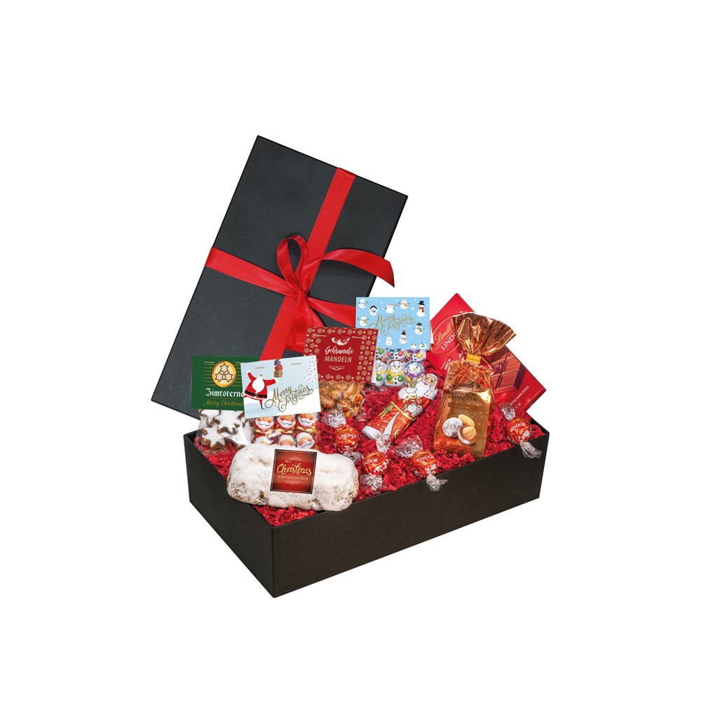 1 Gourmet-Christstollen 200 g, 1 Beutel feuergebrannte Mandeln 30 g, 1 Beutel Mini-Weihnachtsmänner 30 g, 1 Beutel Mini-Schneemänner 30 g, 1 Tafel Lindt Lindor-Schokolade 100 g, 4 Lindt Lindor Kugeln Vollmilch je 12,5 g, 1 Beutel Zimtsterne 30 g, 1 Beutel Lindt Weihnachtsmandeln 100 g (gerösteten Mandeln in Gianduja Milchschokolade und Vollmilchschokolade), 1 Lindt Weihnachtsmann 40 g, verpackt in einer hochwertigen Geschenk-Box inkl. Einzel-Postversandkarton. • Optional kann die Geschenkverpackung mit einem Anhänger 4c an der Schleife, einer Banderole 4c um die Geschenk-Box herum oder einem Druck 1c direkt auf den Deckel individualisiert werden. Desweiteren können der Stollen mit einem Etikett 4c und die Tüten mit Mini-Weihnachtsmännern, gebrannten Mandeln und Zimtsternen mit einen Reiter 4c individualisiert werden. Das Präsent ist postversandfähig verpackt.