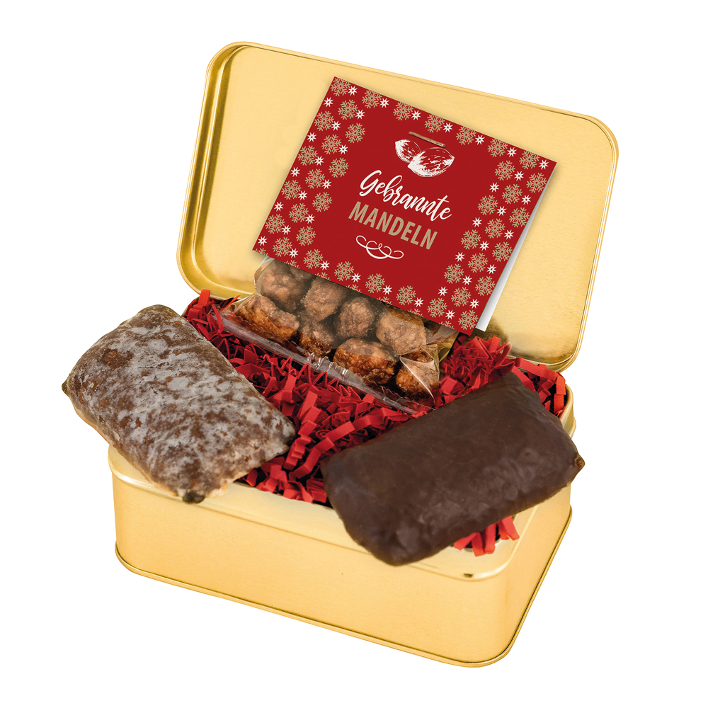 1 hochwertige, goldene Stülpdeckeldose mit Schleifenband rot, gefüllt mit: 1 Tüte gebrannte Mandeln 30 g, 1 Schokoladen-Elisen-Lebkuchen 25 g und 1 Elisen-Lebkuchen glasiert 25 g. • Die Goldbox kann mit einem 1c Druck und mit einem 4c Etikett auf dem Deckel oder mit einem 4c Anhänger am Schleifenband veredelt werden.