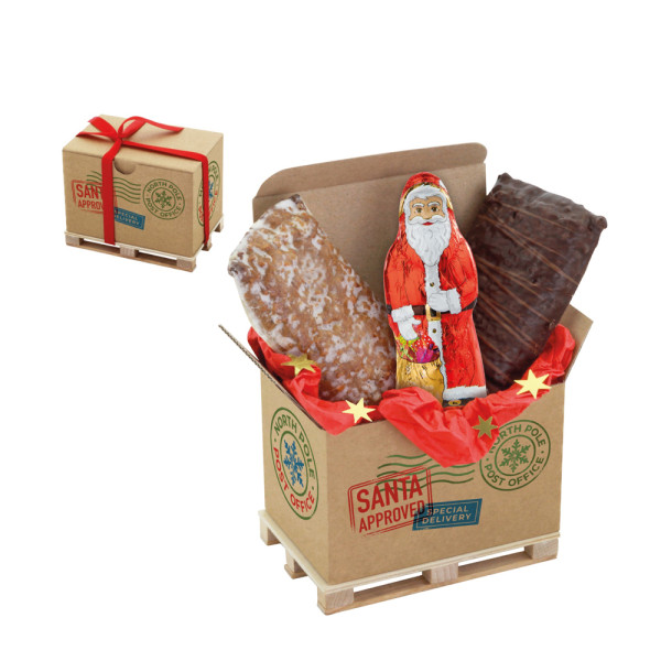 1 origineller Palettencontainer aus Karton mit Standard-Druck "Santa Approved - Special Delivery" mit Schleifenband auf einer Minipalette aus Echtholz, gefüllt mit: 1 Schoko Weihnachtsmann 25 g, 1 Elisenlebkuchen glasiert 25 g und 1 Elisenlebkuchen mit Schokolade 25 g. • Die praktische Cargo-Box ist eine nachhaltige Geschenkverpackung aus 70% recyceltem Material, sowie 30% Material aus kontrollierter Waldwirtschaft und kann mit einem Druck 4c, Druck 1c, Etikett 4c, Anhänger 4c und ab 3000 Stück mit einem 4c All-Over Druck individualisiert werden. Zusätzlich kann auch die Mini-Holz-Palette mit einem 1c Druck veredelt werden.