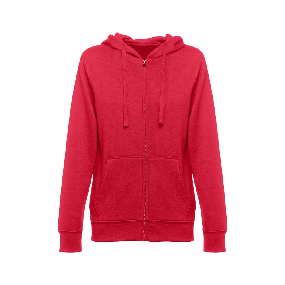 Damen Sweatjacke aus 50% Baumwolle und 50% Polyester (320g/m²) mit Reißverschluss und gefütterter Kapuze mit Kordelzug. Kardiert mit 2 Kängurutaschen, einem verdeckten Kunststoffreißverschluss und einem gerripten Bund. Größen: S, M, L, XL, XXL