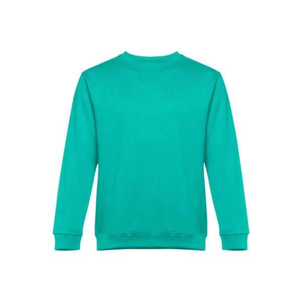 Sweatshirt aus 50% Baumwolle und 50% Polyester (300g/m²), unisex. Innen kardiert, 1x1 Ripp, Bund am Ärmel und Saum, Doppelnaht und Verstärkungsband am Kragen. Größen: S, M, L, XL, XXL