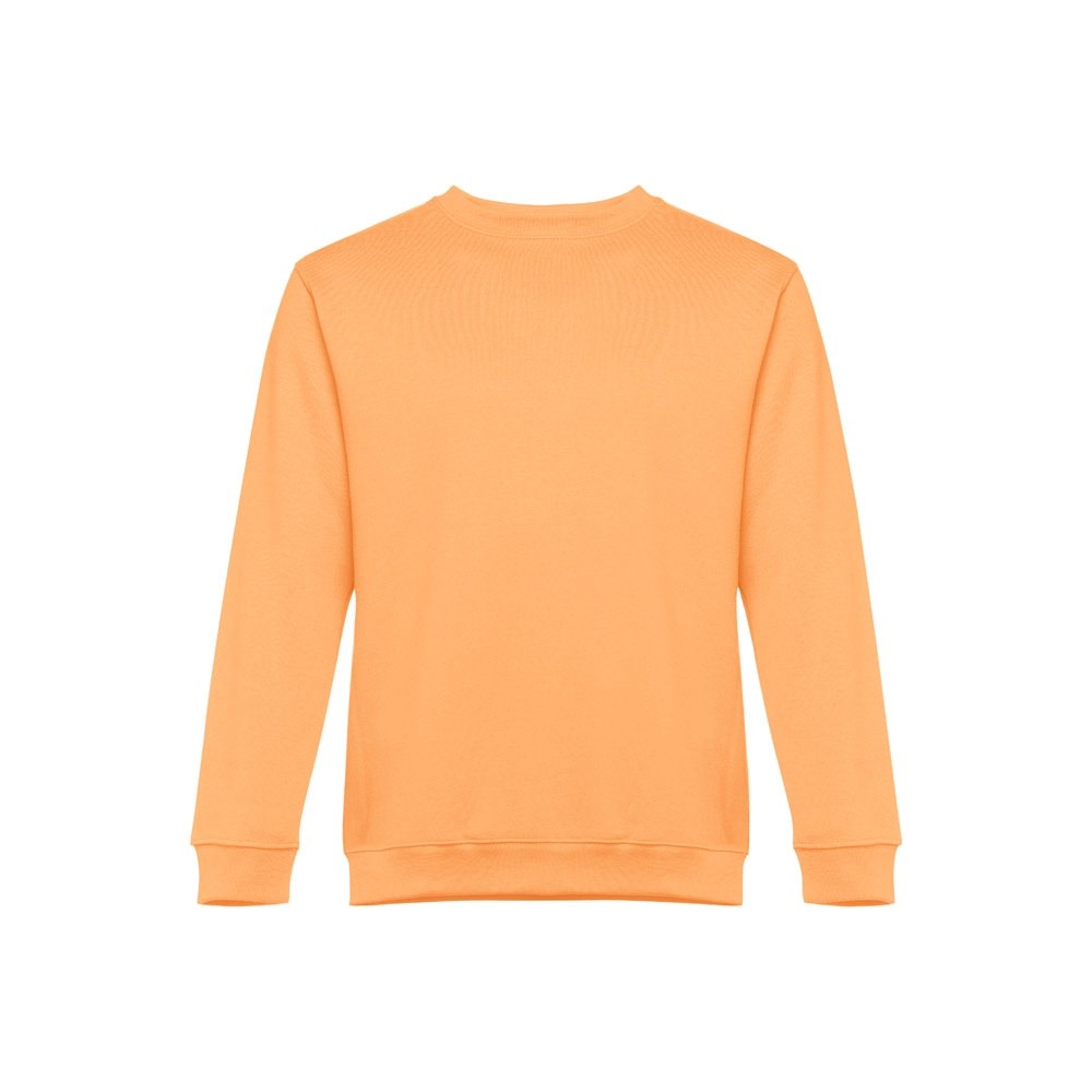 Sweatshirt aus 50% Baumwolle und 50% Polyester (300g/m²), unisex. Innen kardiert, 1x1 Ripp, Bund am Ärmel und Saum, Doppelnaht und Verstärkungsband am Kragen. Größen: S, M, L, XL, XXL