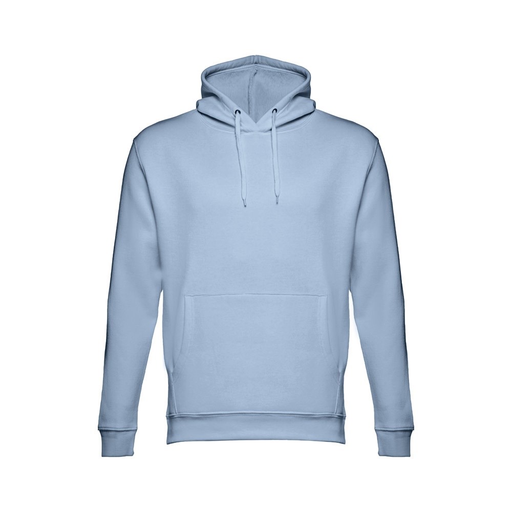 Sweatshirt aus 50% Baumwolle und 50% Polyester (320g/m²), unisex mit einer Kapuze mit Kordelzug. Innen kardiert, 1x1 Ripp, Bund an Ärmel und einer Kängurutasche. Größen: XS, S, M, L, XL, XXL