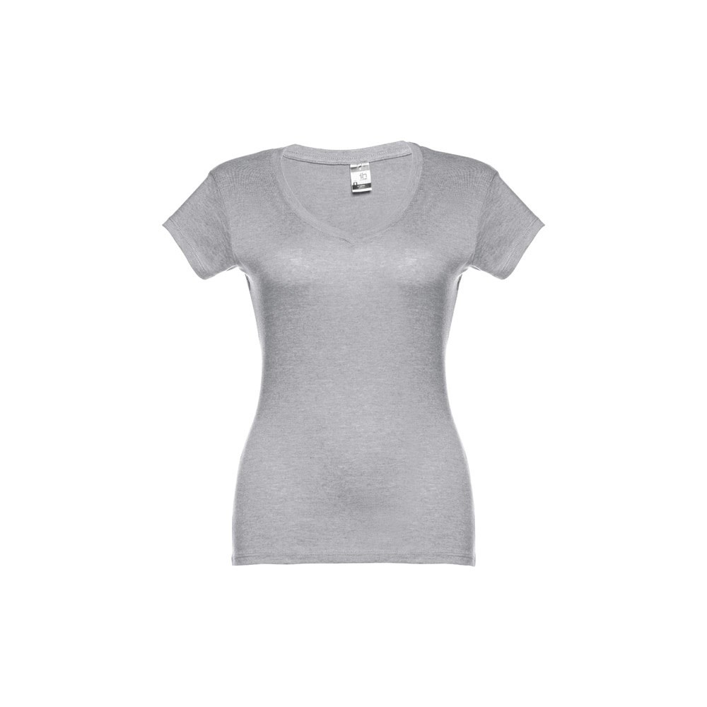 Damen T-Shirt aus 100% Strickjersey und Baumwolle (150g/m²) mit kardiertem Baumwollfaden, tailliert, überlapptem V-Ausschnitt, Verstärkungsband, Jersey-Kragen und Doppelnaht an Ärmeln und Saum. Bei den Farben 194, 195 und 199 bestehend aus 60% Baumwolle und 40% Polyester. Größen: S, M, L, XL, XXL