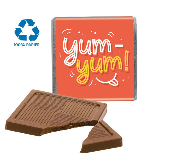 Quadratisches Schokotäfelchen, zuerst im Pergamin verpackt und dann in eine Werbebanderole... mehr