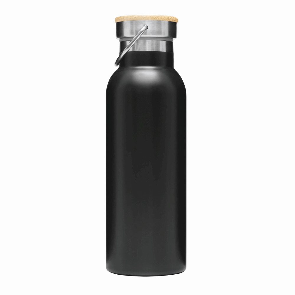 Vakuum-Trinkflasche ECO FLAVOUR, doppelwandig: innen und außen aus Edelstahl, Bambus-Deckel mit sicherem Schraubverschluss, Silikon-Dichtring und Tragegriff, Füllmenge ca. 500 ml, hält ca. 8 Stunden warm und bis zu 12 Stunden kalt