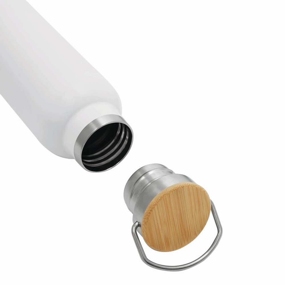 Vakuum-Trinkflasche ECO FLAVOUR, doppelwandig: innen und außen aus Edelstahl, Bambus-Deckel mit sicherem Schraubverschluss, Silikon-Dichtring und Tragegriff, Füllmenge ca. 500 ml, hält ca. 8 Stunden warm und bis zu 12 Stunden kalt