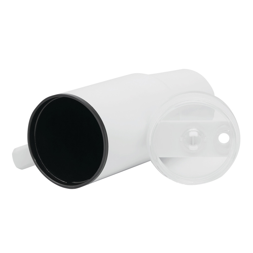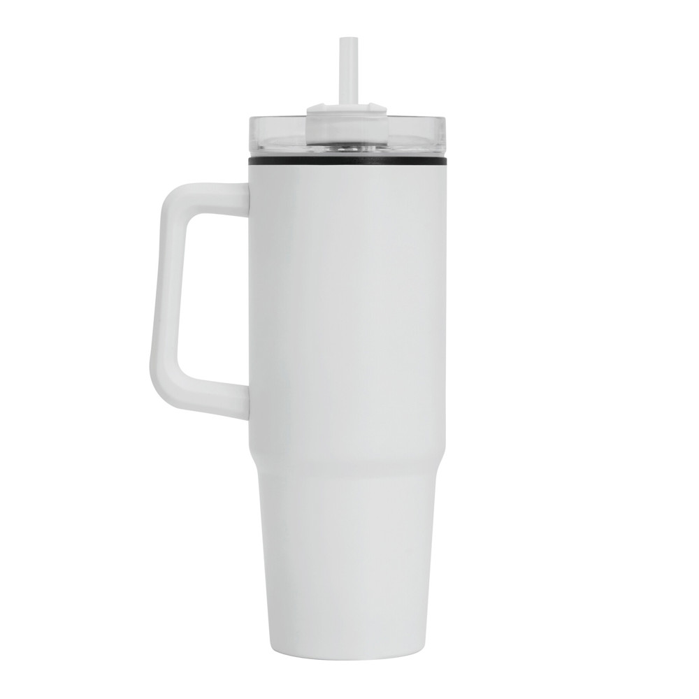 Trinkbecher DRINK ULTY, doppelwandig: innen aus Kunststoff und außen aus Edelstahl, mit praktischem Griff, transparenter Kunststoff-Deckel mit sicherem Schraubverschluss, Silikon-Dichtring, Trinköffnung mit Drehverschluss und transparentem Strohhalm, beschichteter Boden für gute Oberflächenhaftung, Füllmenge ca. 900 ml, hält ca. 2 Stunden warm und bis zu 4 Stunden kalt, in Box