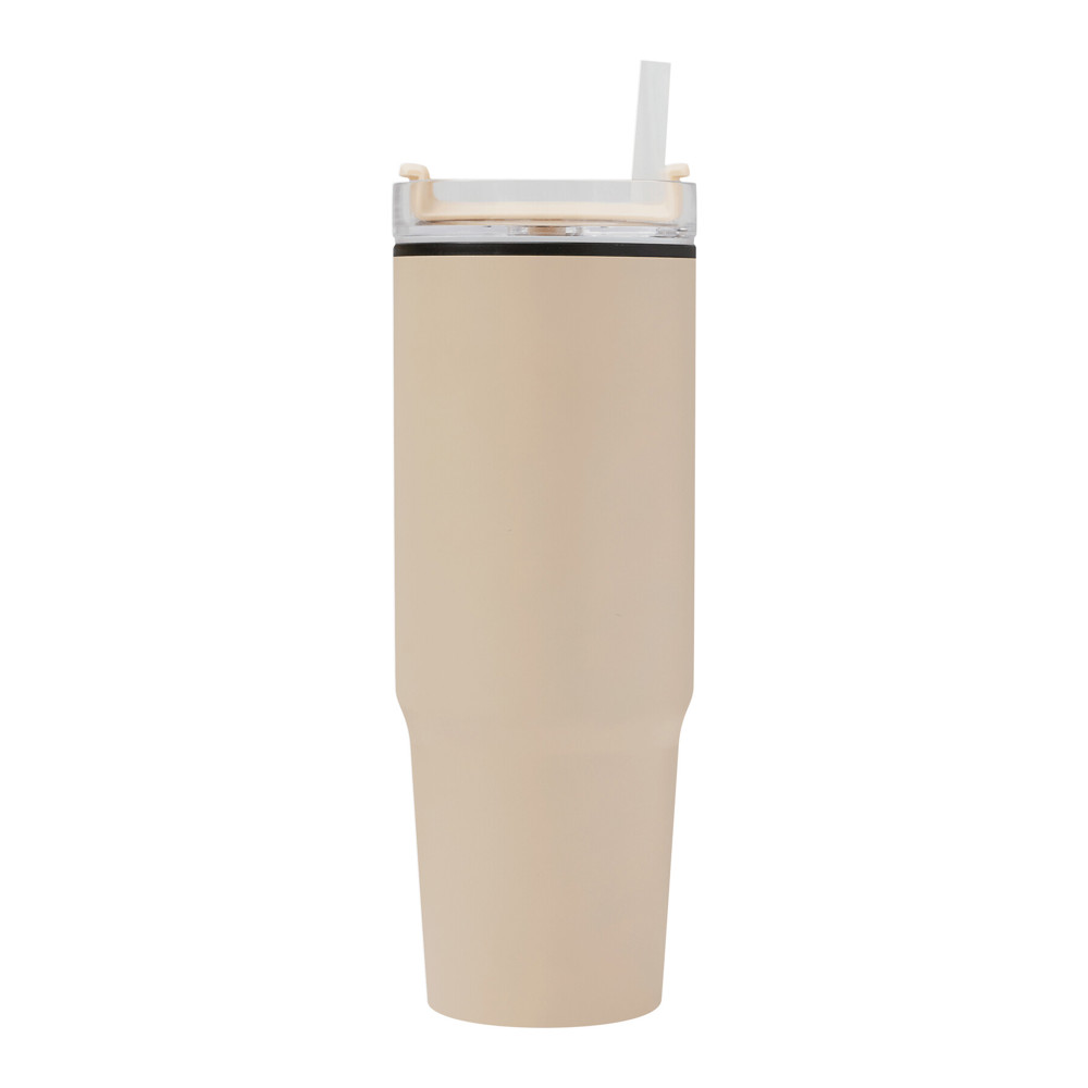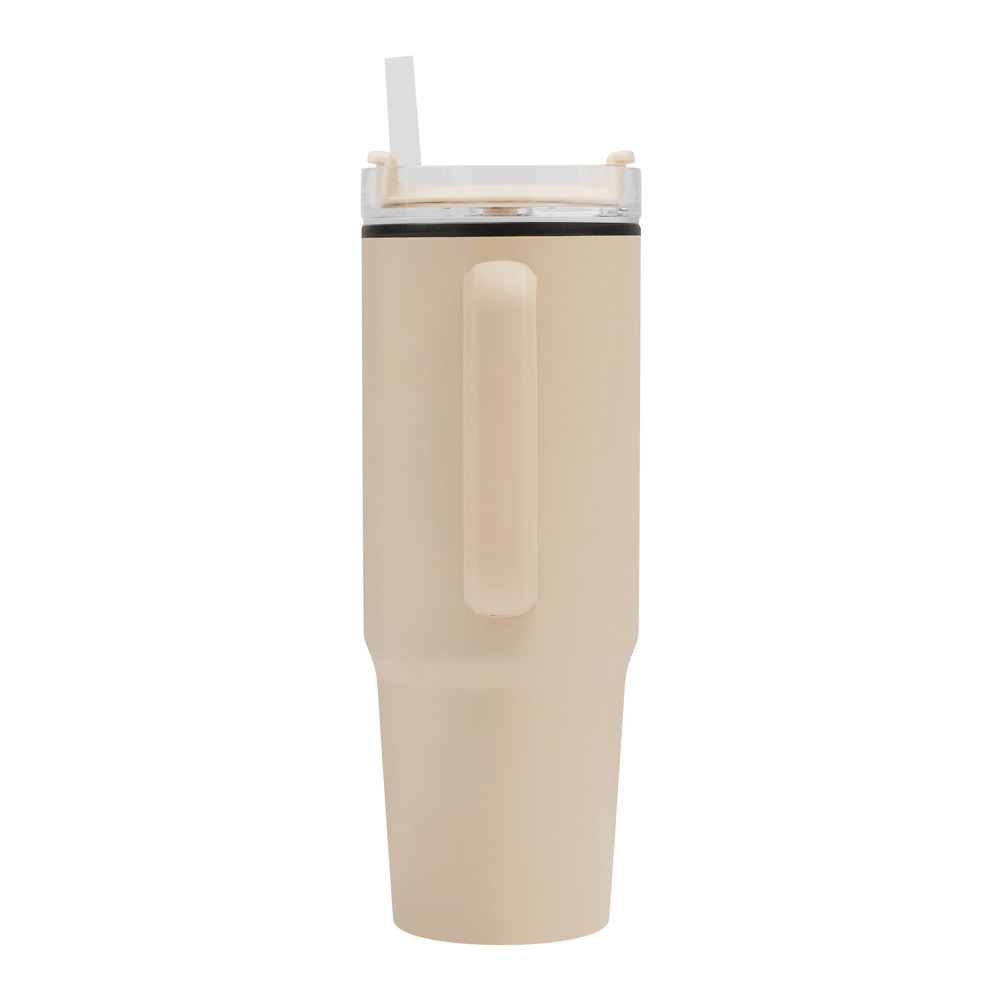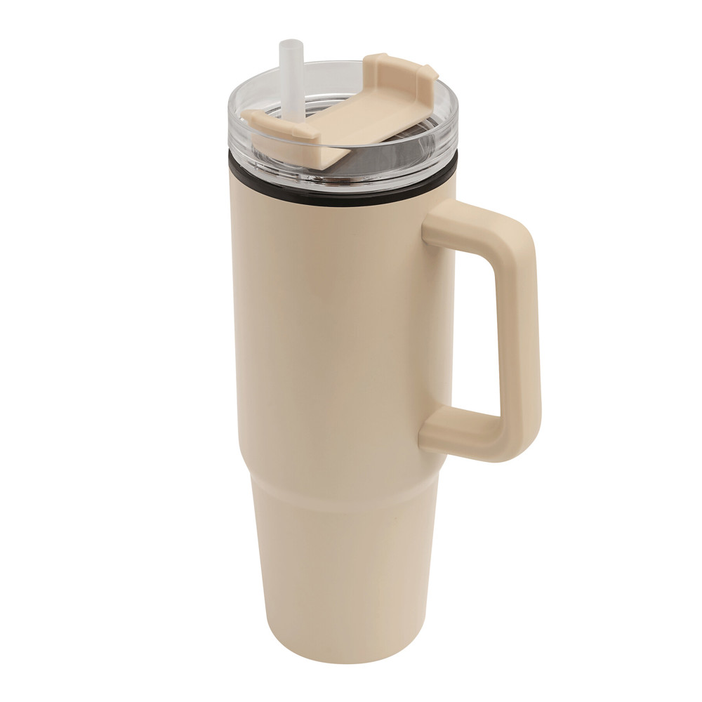 Trinkbecher DRINK ULTY, doppelwandig: innen aus Kunststoff und außen aus Edelstahl, mit praktischem Griff, transparenter Kunststoff-Deckel mit sicherem Schraubverschluss, Silikon-Dichtring, Trinköffnung mit Drehverschluss und transparentem Strohhalm, beschichteter Boden für gute Oberflächenhaftung, Füllmenge ca. 900 ml, hält ca. 2 Stunden warm und bis zu 4 Stunden kalt, in Box