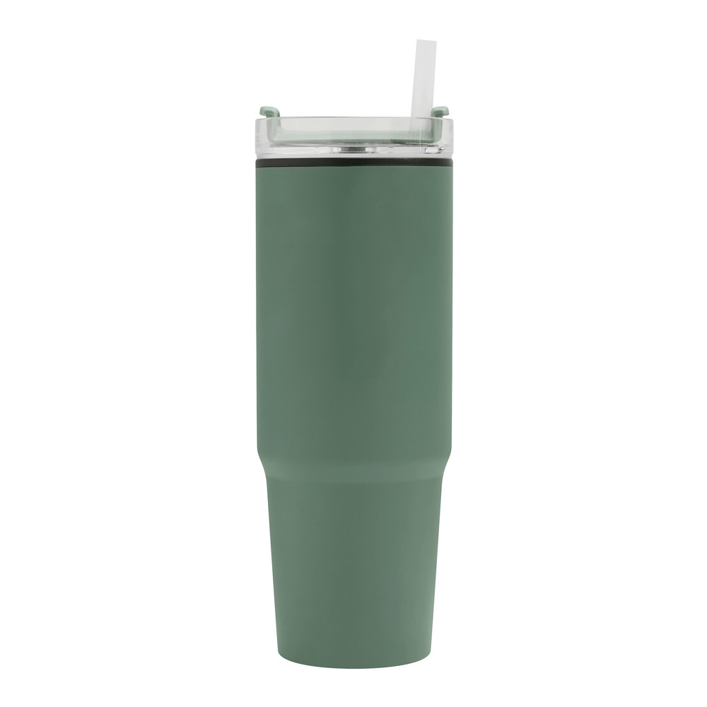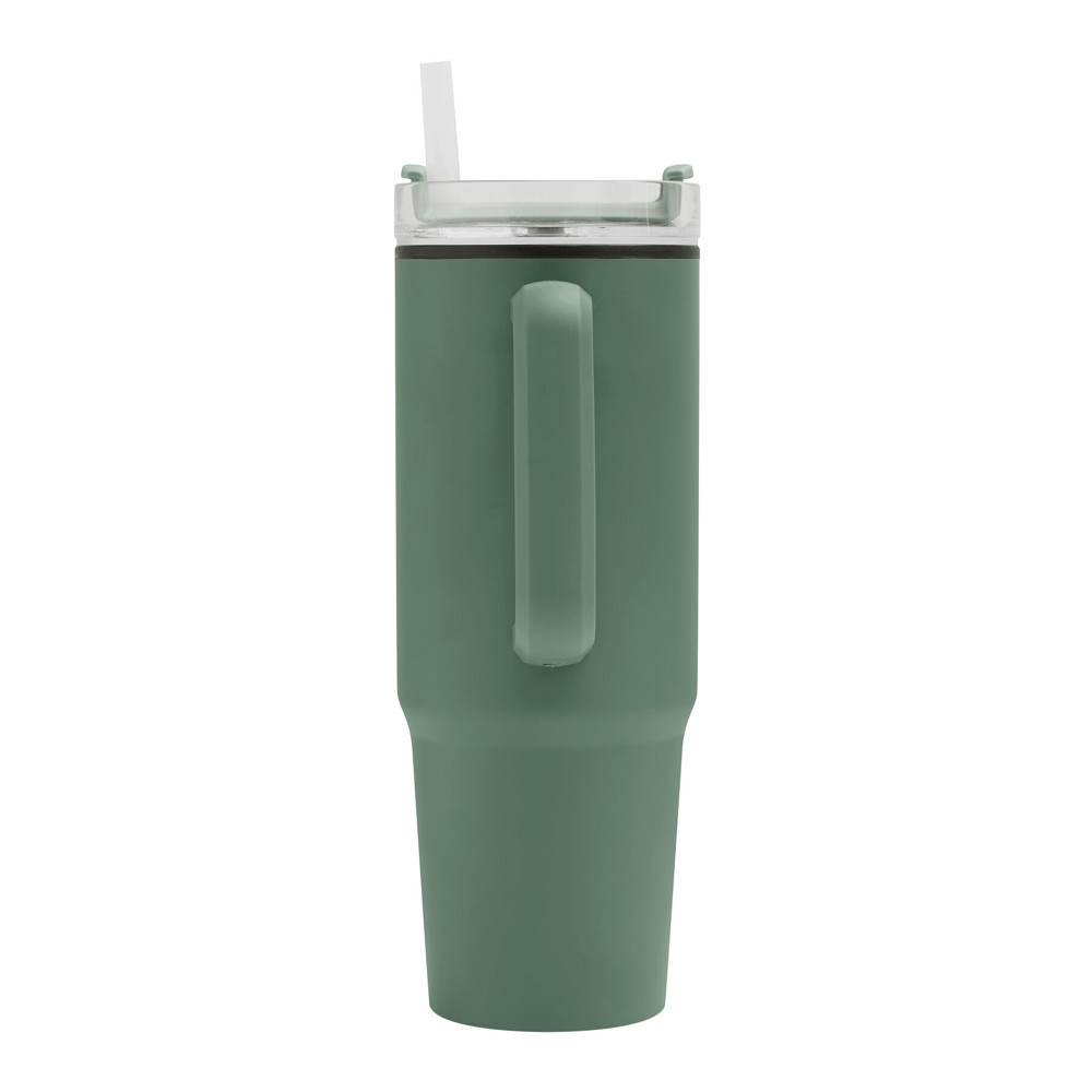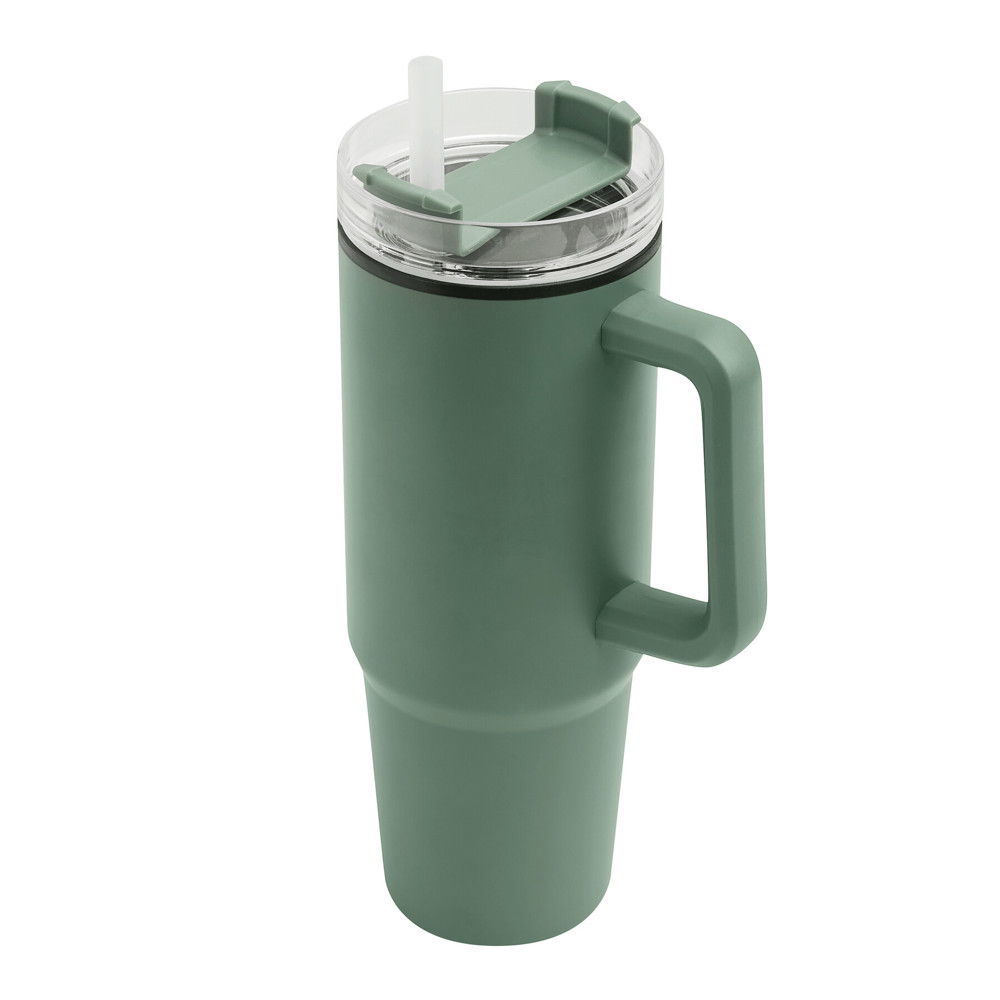 Trinkbecher DRINK ULTY, doppelwandig: innen aus Kunststoff und außen aus Edelstahl, mit praktischem Griff, transparenter Kunststoff-Deckel mit sicherem Schraubverschluss, Silikon-Dichtring, Trinköffnung mit Drehverschluss und transparentem Strohhalm, beschichteter Boden für gute Oberflächenhaftung, Füllmenge ca. 900 ml, hält ca. 2 Stunden warm und bis zu 4 Stunden kalt, in Box