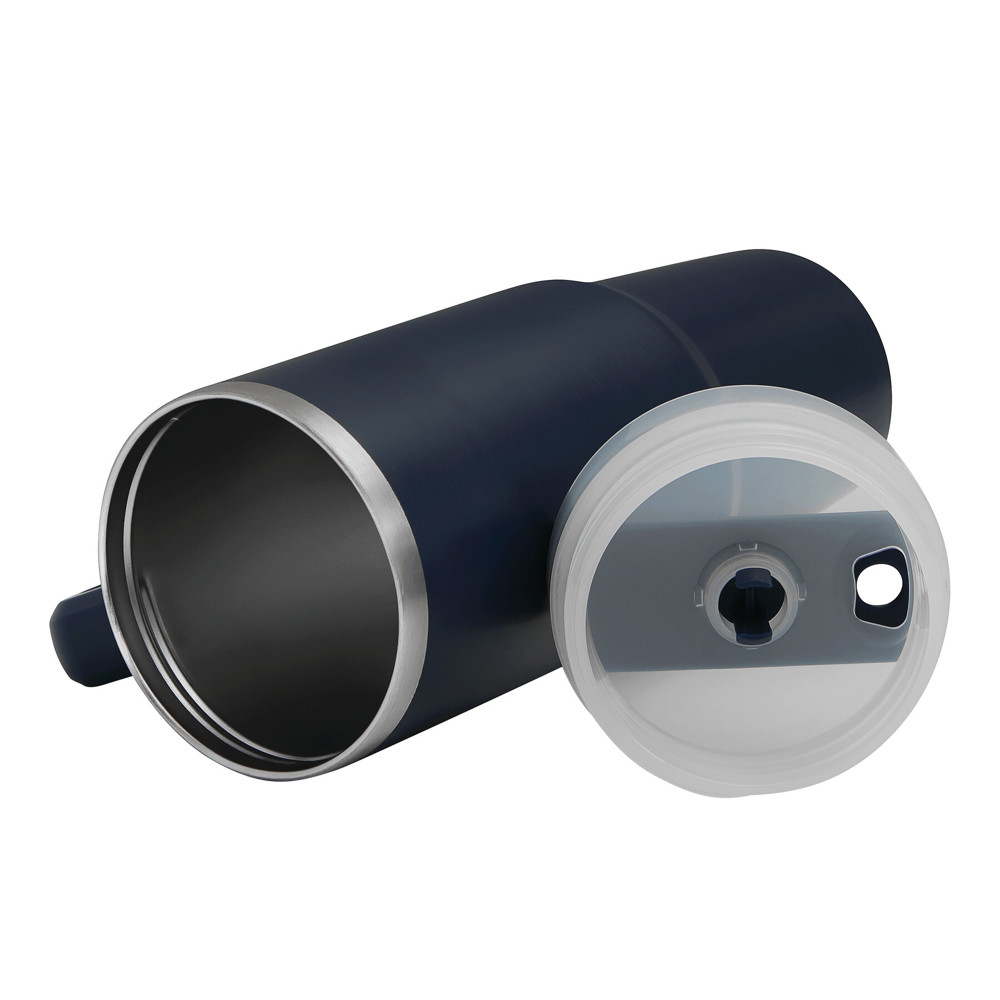 Vakuum-Isolierbecher DRINK DELUXE, doppelwandig: innen und außen aus Edelstahl, mit praktischem Griff, milchig-transparenter Kunststoff-Deckel mit sicherem Schraubverschluss, Silikon-Dichtring, Trinköffnung mit Drehverschluss und transparentem Strohhalm, beschichteter Boden für gute Oberflächenhaftung, Füllmenge ca. 900 ml, hält ca. 5 Stunden warm und bis zu 10 Stunden kalt, in Box