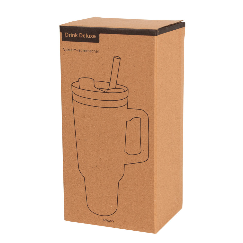 Vakuum-Isolierbecher DRINK DELUXE, doppelwandig: innen und außen aus Edelstahl, mit praktischem Griff, milchig-transparenter Kunststoff-Deckel mit sicherem Schraubverschluss, Silikon-Dichtring, Trinköffnung mit Drehverschluss und transparentem Strohhalm, beschichteter Boden für gute Oberflächenhaftung, Füllmenge ca. 900 ml, hält ca. 5 Stunden warm und bis zu 10 Stunden kalt, in Box