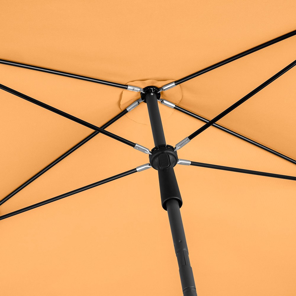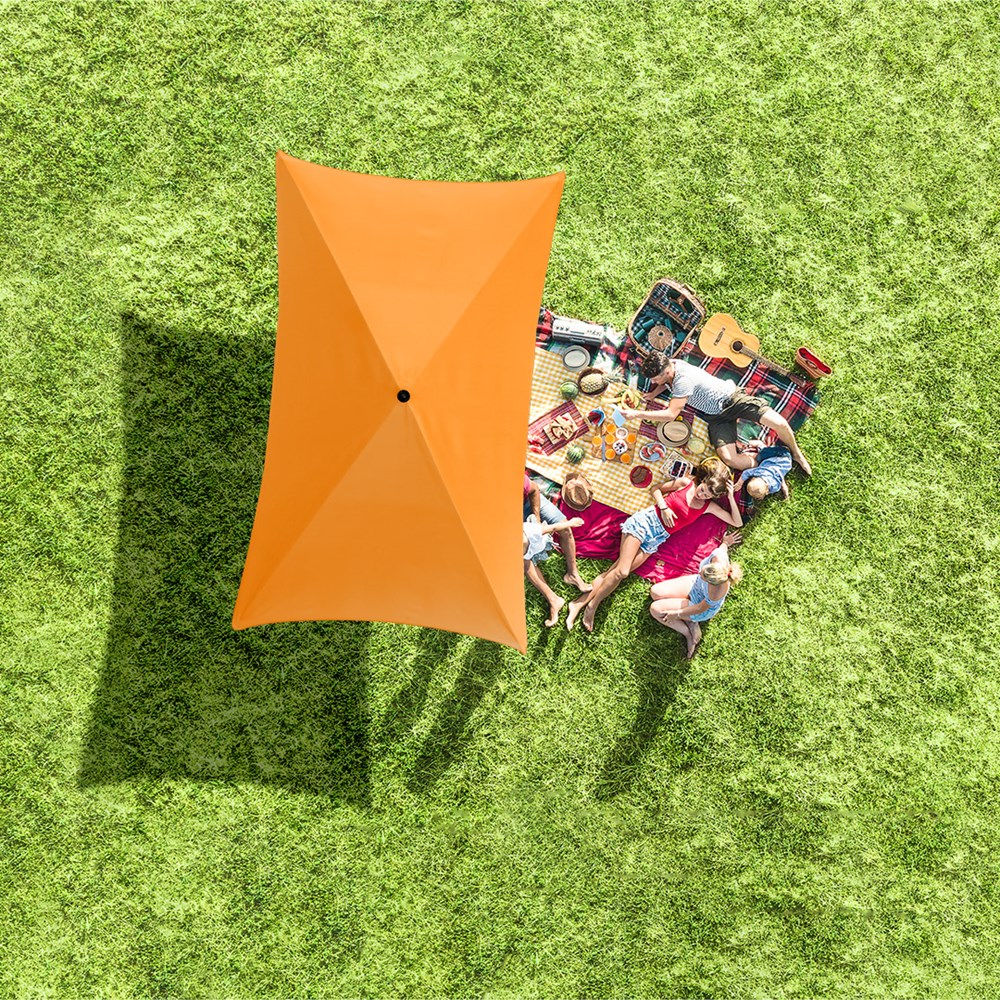 Moderner, rechteckiger Sonnenschirm mit Gestell in Titan-Finish, Knickvorrichtung und mit Volant Einfache Handhabung durch Sicherheitsschieber, sehr stabile Fiberglasschienen, zweiteiliger und stufenlos höhenverstellbarer Stock mit Knickvorrichtung zur Neigung des Schirms, Stock in edlem Titan-Finish, Unterstock mit ca. 119 cm Länge und Drehfeststeller zur sicheren Fixierung, komfortables Tragefutteral, hochqualitativer Bezug mit einer Grammatur von ca. 200 g/m² und Lichtschutzfaktor UPF 50+, exklusive Füllständer (Art. 8920 oder Art. 8905) / Erdspieß (Art. 8939)