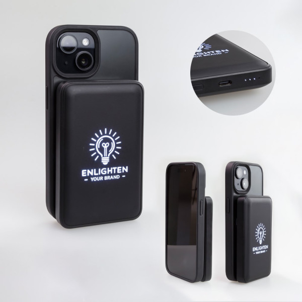 Magnetisches Ladegerät in rABS Gehäuse mit 10.000 mAh Leistung und kabellosem laden bis zu 15 Watt. Durch den integrierten Magneten dockt das Ladegerät am Iphone® an und sorgt für schnelles und kabelloses Laden. Kompatibel ab Iphone® 12, bei anderen QI-fähigen Modellen kann sie als Wireless Charger verwendet werden. Die Werbeanbringung ist als weisses Leuchtlogo auf der Rückseite möglich. Inkl. Ladekabel TypC und brauner Einzelverpackung.