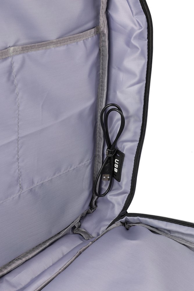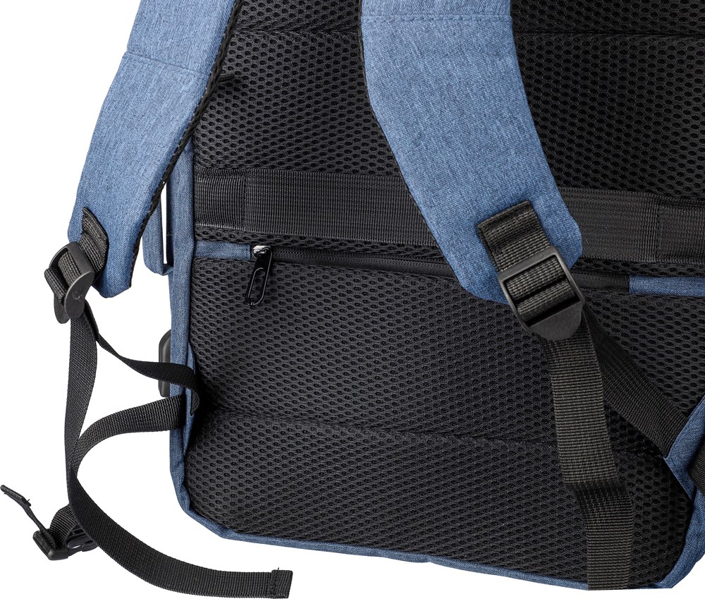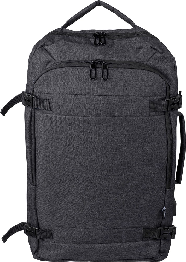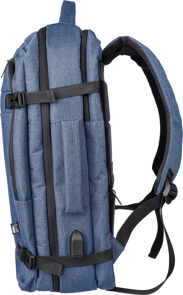 Rucksack und Laptoptasche (17”) aus rPET-Polyester (300D) mit 210D-Innenfutter. Mit Trageschlaufe oben und seitlich. Laptopfach mit Klettverschluss, diebstahlsichere Tasche und zwei große Fächer mit Reißverschluss. Belüftete, gepolsterte Rückseite, Trolleyriemen, Verschlussschnallen und USB-A-Anschluss an der Seite. Mit seitlichen Schnallen, um das Gepäck kompakt zu halten. Tragegewicht ca. 12 kg. Inklusive rPET-Etikett.