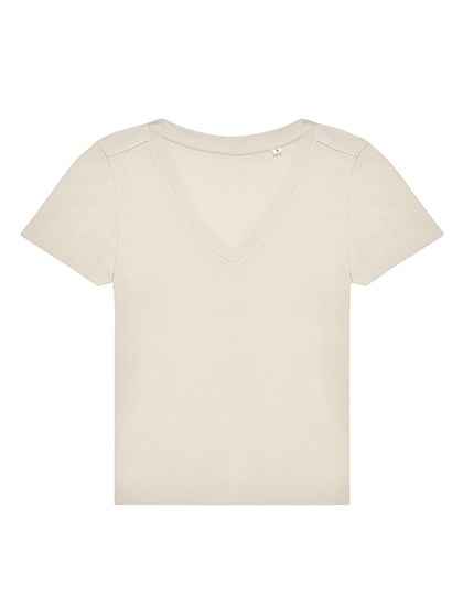 100% einlaufvorbehandelte, ringgesponnene Baumwolle | Single-Jersey | Klassische moderne Passform | Mit Seitennaht | Femininer Ausschnitt mit verstärktem V | Nackenband für sauberen Abschluss | Vorverlegte Schulternähte | Kein Label | Widerstandsfähiges Material mit weichem Griff