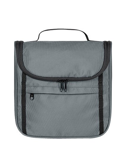 Kulturtasche zum Hängen oder Stellen | Recycelter Oberstoff | Reißverschlussvortasche | Schlaufenband auf der Front | Dreiseitig umlaufender 2-Wege-Reißverschluss | Reißverschluss-Fach im Deckel | Vier Netz-Einsteckfächer innen | Handgriff