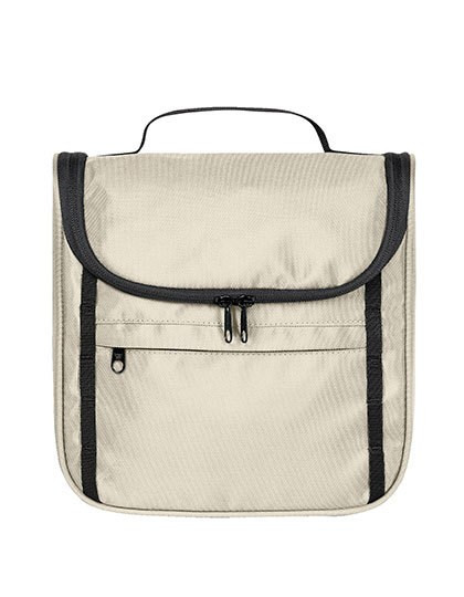 Kulturtasche zum Hängen oder Stellen | Recycelter Oberstoff | Reißverschlussvortasche | Schlaufenband auf der Front | Dreiseitig umlaufender 2-Wege-Reißverschluss | Reißverschluss-Fach im Deckel | Vier Netz-Einsteckfächer innen | Handgriff