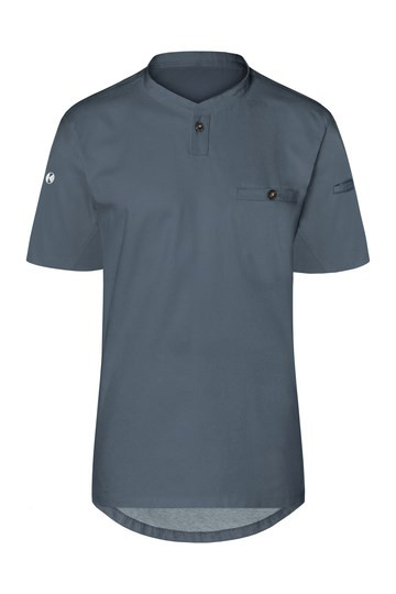 Vorderseite: Köpergewebe; Rückseite: Jersey-Piqué, atmungsaktiv und feuchtigkeitsregulierend | Modernes Arbeitsshirt mit kurzen Ärmeln im sportlich edlem Look | Tailliert geschnitten | Hohe Waschbarkeit | Halsausschnitt mit schmalem Stehkragen und kleiner Knopfleiste | Brustleistentasche mit Knopf | Leistentasche am linkem Ärmel