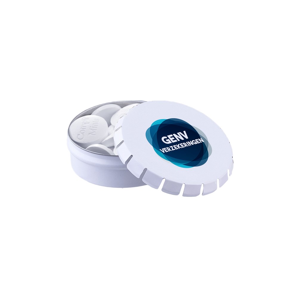 Mini Klick-Klack Dose Weiß mit ca. 23 Gramm Compli'mints, 4c-Euroskala, inkl. Zutatenaufkleber... mehr