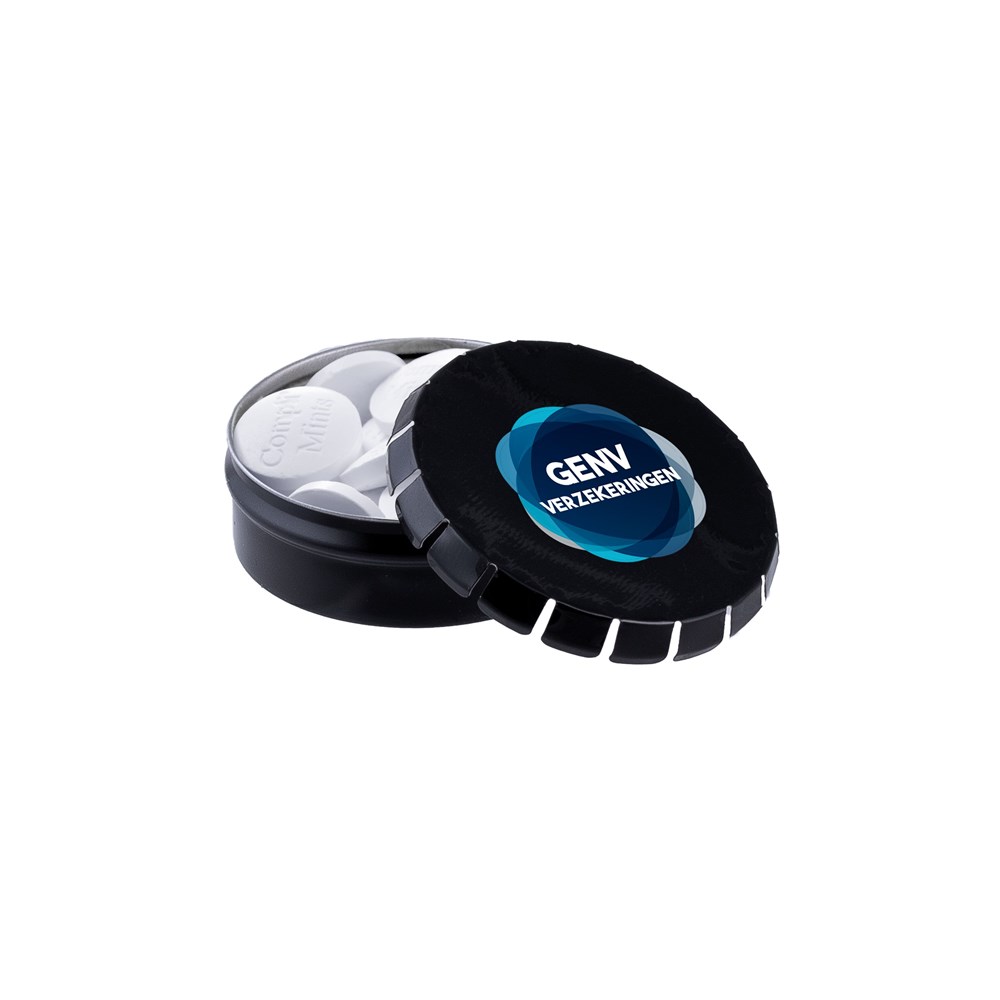 Mini Klick-Klack Dose Schwarz mit ca. 23 Gramm Compli'mints, 4c-Euroskala, inkl. Zutatenaufkleber und eingeschweißt