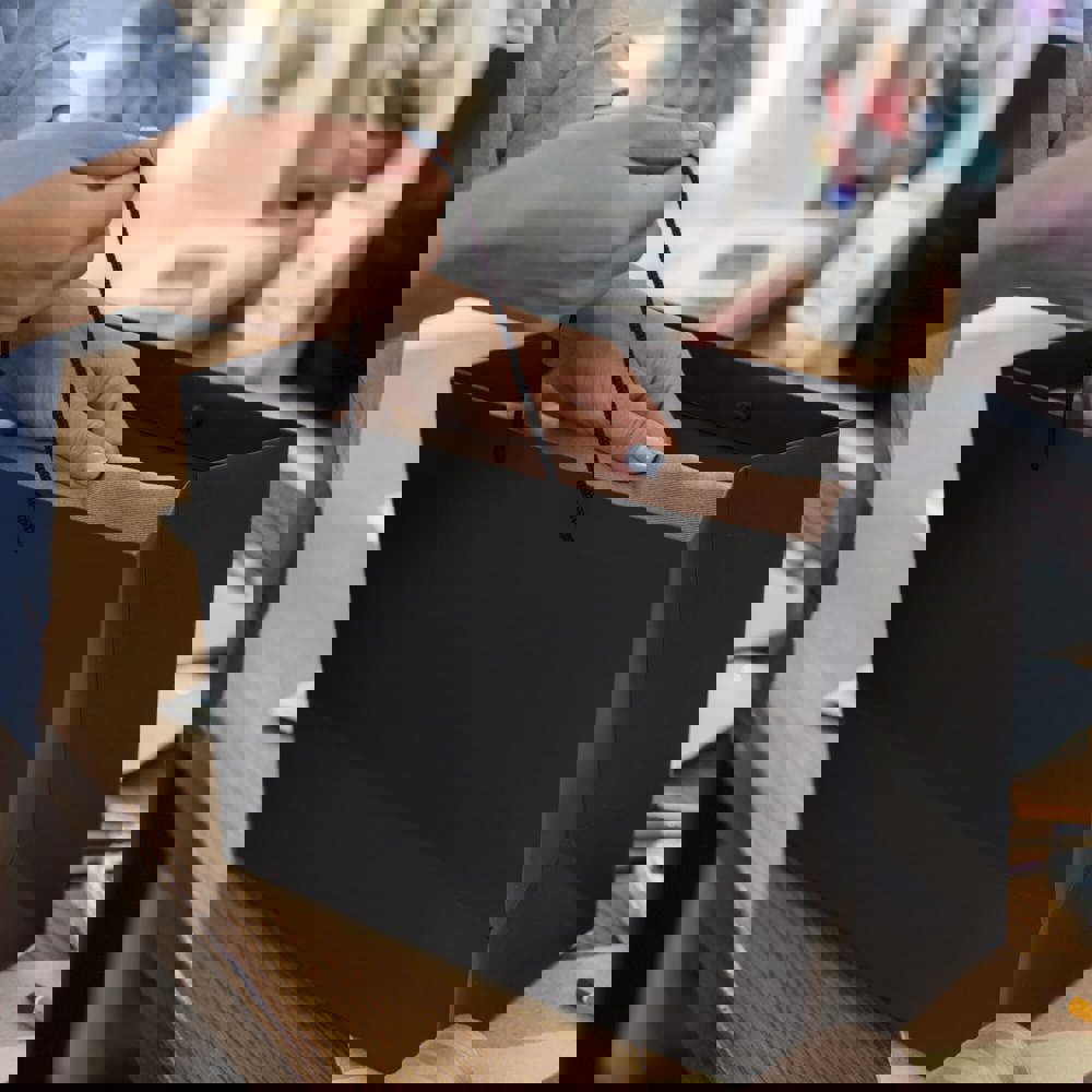 Elegante Geschenktasche aus Papier mit 5 mm dicken Kordeln aus recyceltem Polyester. Sie ist für ein Gewicht von bis zu 5 kg ausgelegt und hat ein luxuriöses Aussehen mit schwarzen Griffen und einer schwarzen Innenseite. Perfekt zum Überreichen von Geschenken.