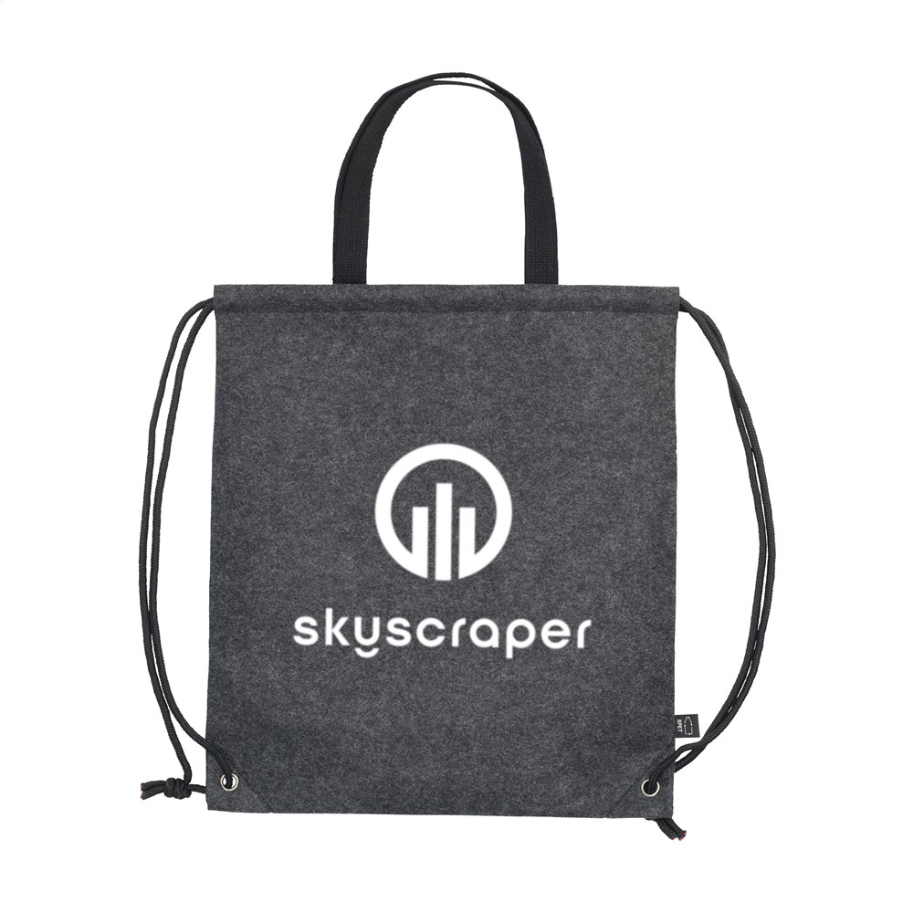 Rucksack aus RPET-Filz (hergestellt aus recycelten PET-Flaschen und recycelten Textilien). Mit Kordelzug und praktischen Trageschlaufen. GRS-zertifiziert. Recyceltes Material insgesamt: 82%. Fassungsvermögen ca. 10 Liter.