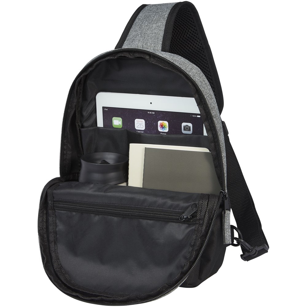 Die zweifarbige GRS-Recycling-Tragetasche besteht außen zu 100 % aus recycelten Materialien und verfügt über eine Vordertasche mit Reißverschluss sowie ein Hauptfach mit Reißverschluss, das eine Hülle für ein 12-Zoll-Tablet enthält. Außerdem verfügt sie über eine Innentasche mit Reißverschluss zur sicheren Aufbewahrung, und mit ihrem voll verstellbaren und gepolsterten Schultergurt ist sie bequem zu tragen.
