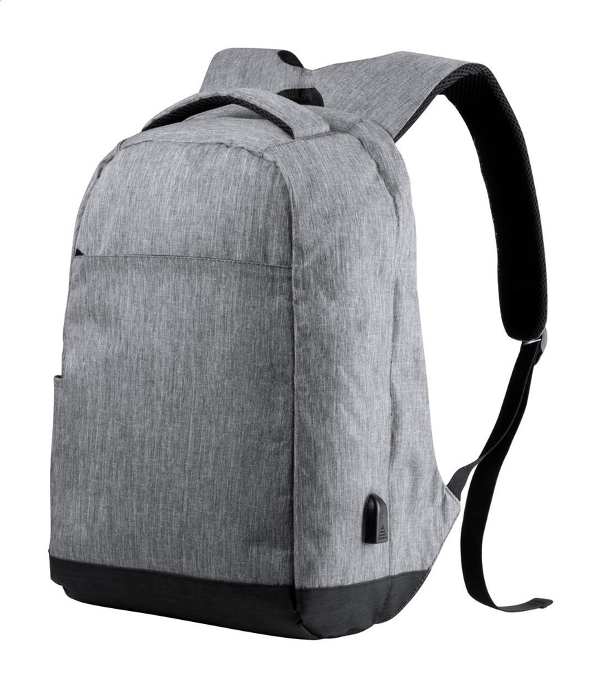 Anti-Diebstahl Rucksack mit mehreren Fächern, gepolstertem Laptop- (15") und Tabletfach (12"), gepolstertem Rücken und Schultergurten, Trolleygurt und eingebauter USB-Verbindung für Powerbanks. Material: 300D Polyester.