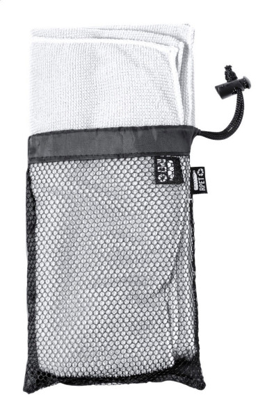 Sporthandtuch aus Mikrofaser mit RPET-Beutel und abtrennbarem RPET-Label. Material: RPET-Polyester (160 g/m²).